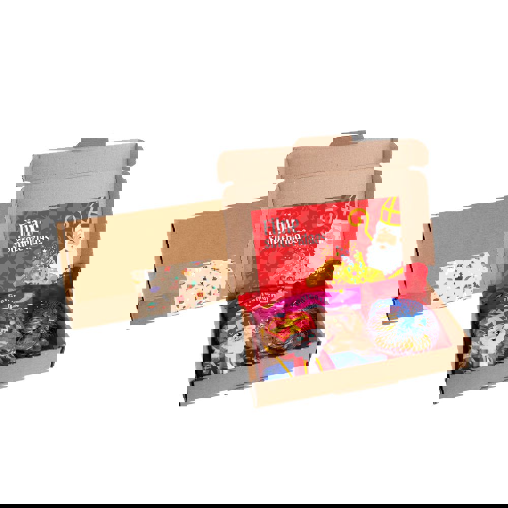 Brauner Versandkarton, gefüllt mit einer Beutel mit "Strooigoed" und einem Schokoladenmünzen. Ausgestattet mit einer doppelseitig bedruckten A6-Karte und verschlossen mit einem Standard "Sinterklaas" Aufkleber.