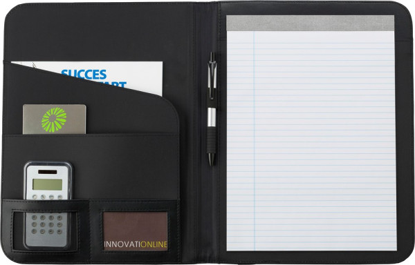 schwarze Schreibmappe mit Organizer-Elementen; verschließbar mit farbigem Gummiband; inkl. Schreibblock; flaches Einsteckfach; Gummischlaufe für Kugelschreiber